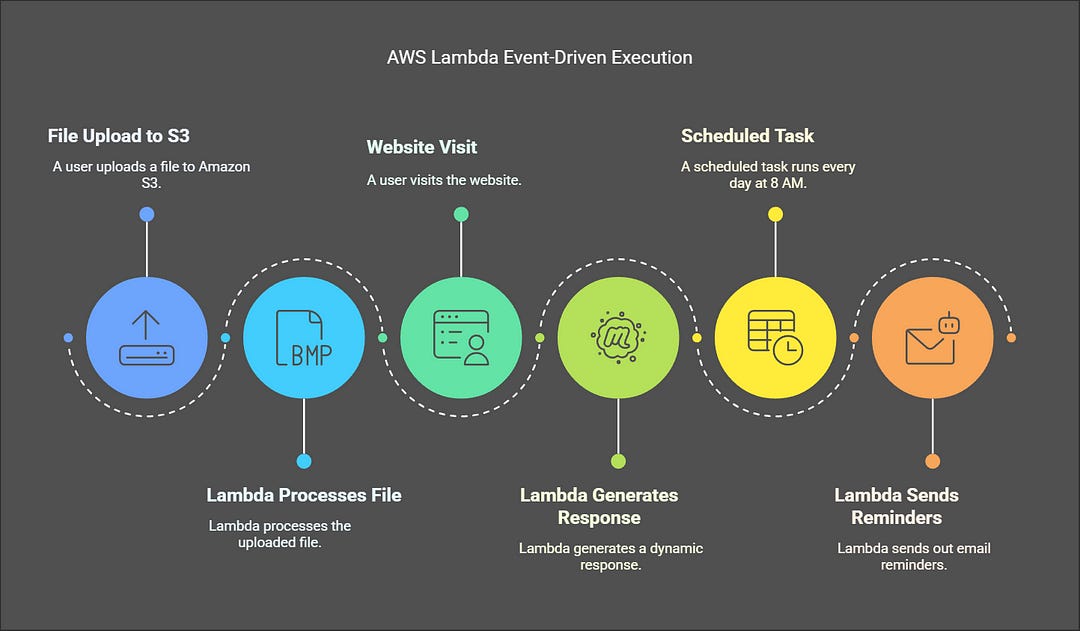 Here’s the beauty of AWS Lambda: it works on an event-driven model. This means your code runs in response to specific triggers or events. For example:
